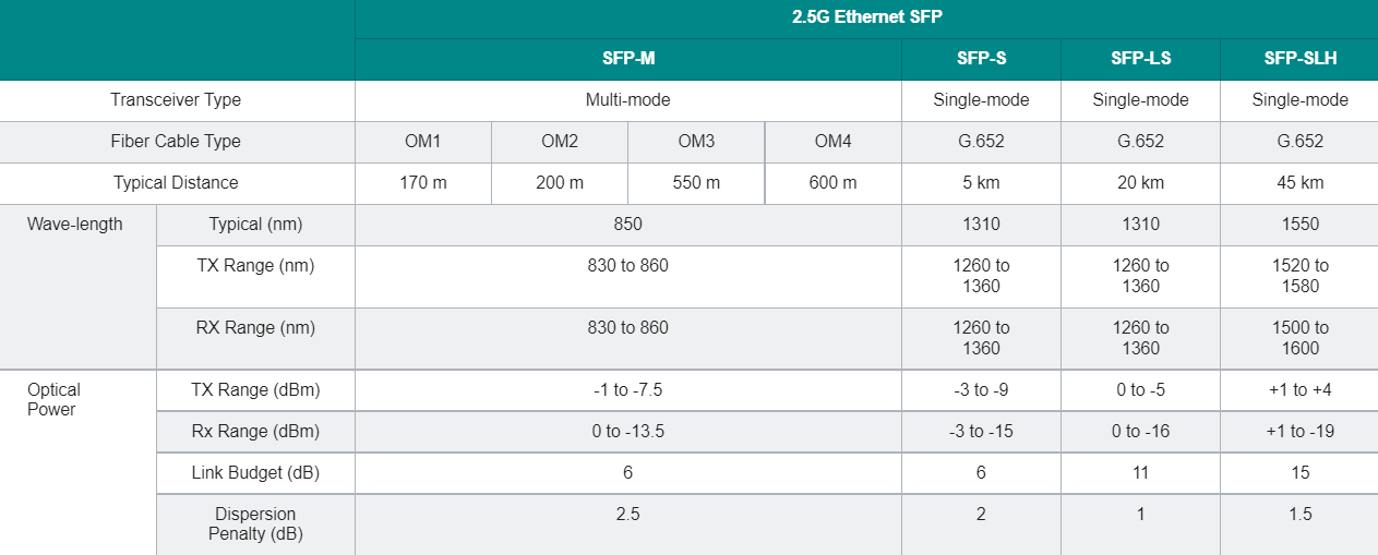 | Optical Fiber | Typical Distance: To reach the typical distance of specified fiber transceiver, please refer to formula: Link budget(dB) > dispersion penalty(dB) + total link loss(dB) |