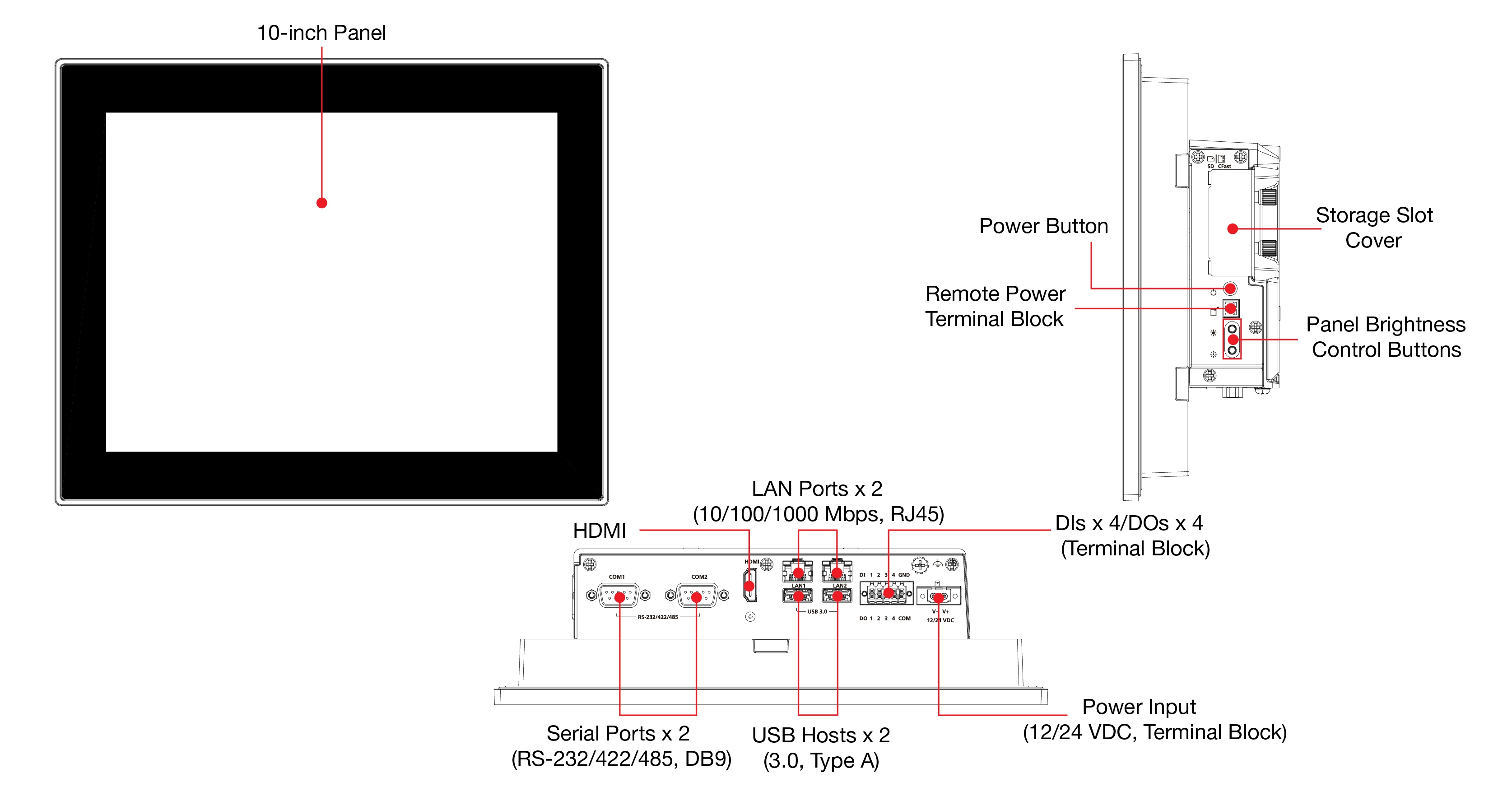 The MPC-3100 10.4-inch panel computers with Intel Atom® x6211E dual-core or x6425E quad-core processor deliver a reliable, durable, and versatile platform for use in industrial environments. With two software selectable RS-232/422/485 serial ports and two Gigabit Ethernet ports, the MPC-3100 panel computers support a wide variety of serial interfaces as well as high-speed IT communications, all with native network redundancy.